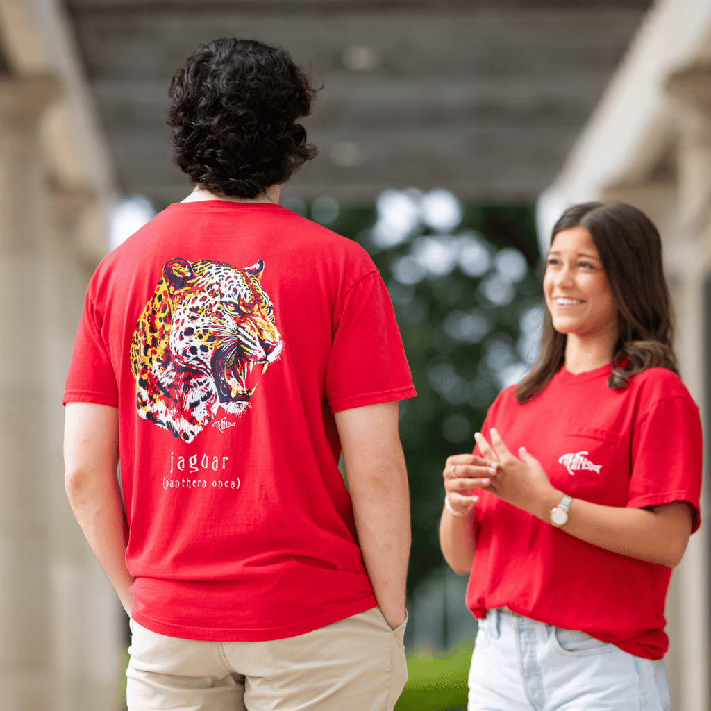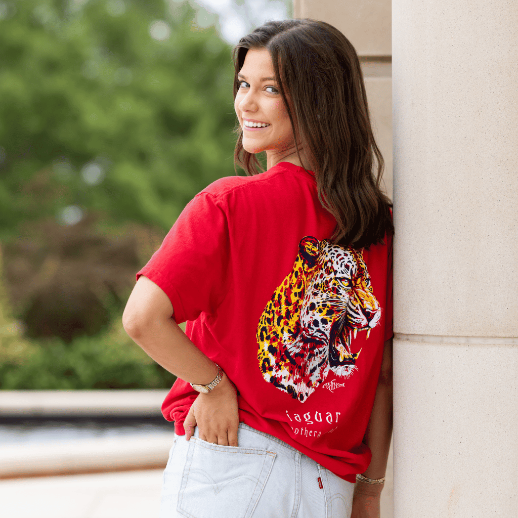 Show your school spirit with the Jaguar Comfort Colors® tee in Red, part of our Collegiate Collection. Crafted from 100% ring-spun cotton, this preshrunk, soft-washed, garment-dyed pocket t-shirt delivers that soft, lived-in feel you’ll love wearing every day. Built with double-needle stitched sleeves, bottom hem, and twill-taped shoulders for lasting durability, it features a bold jaguar design on the front pocket - perfect for students, alumni, and fans who want to display their pride in classic Comfort Colors® style.
